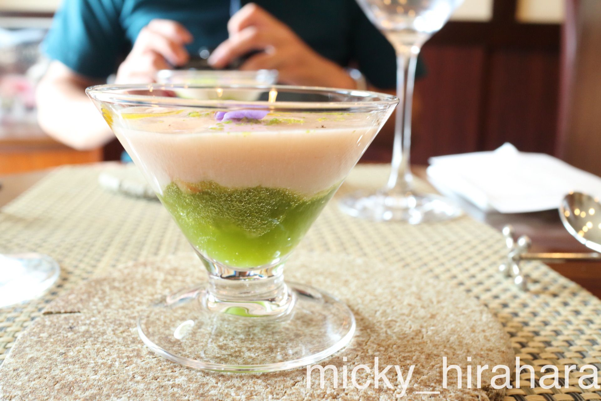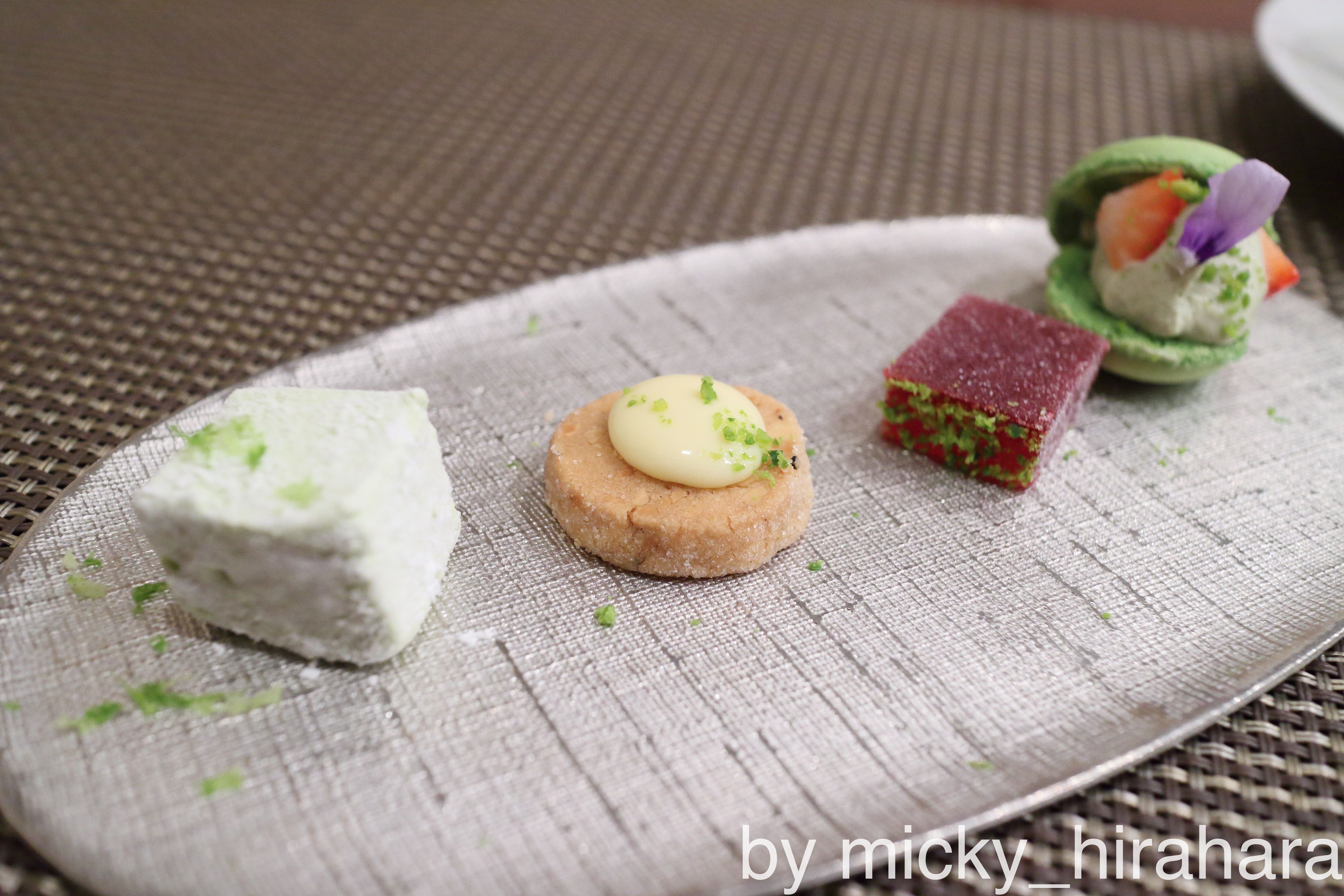 写真はアスパラのジュレだったり、鴨肉のローストが出てきたり、ピスタチオのスープなどコースによって出てくるものが変わりますが、舌をリセットし次のスイーツを美味しく食べるための工夫がされているのが良いなと感じました。