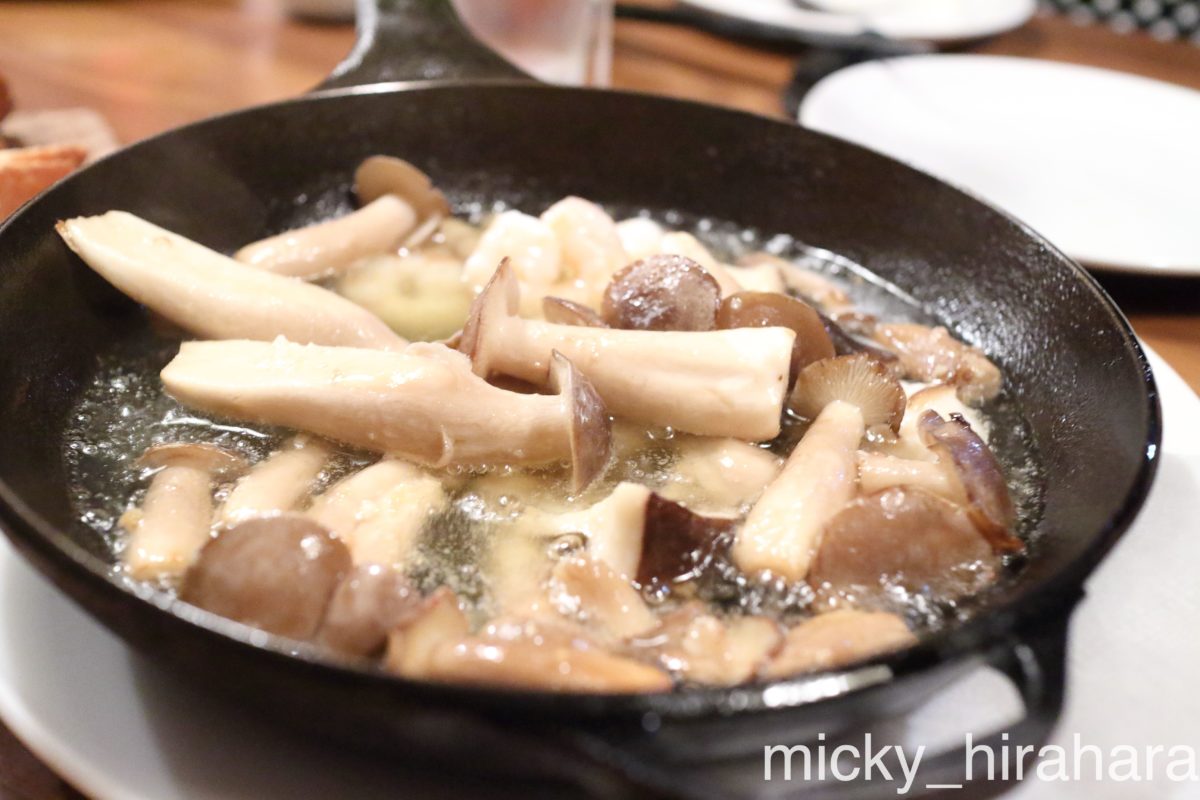 熱々のオリーブオイルにたっぷりと丹波産のしめじとエビが浸かっている。