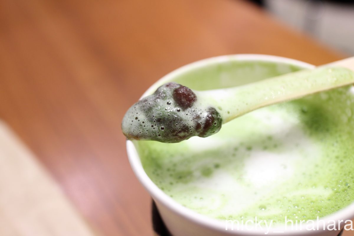 抹茶の香りはほどほとですが、スプーンですくうとあんこがお目見えし食べると上品な甘さのあんこであります。