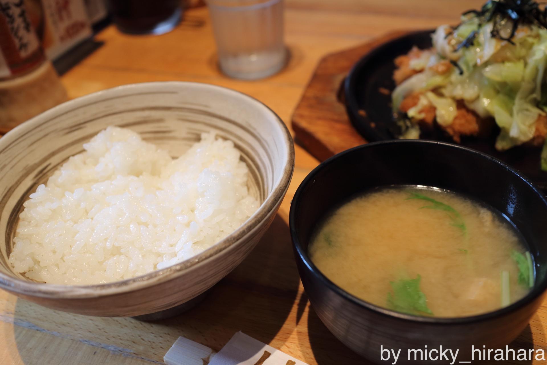 この定食はとんかつ茶漬けと名前が付いていますが、最初はとんかつ定食のように普通にご飯+味噌汁ととんかつで食べていきます。
